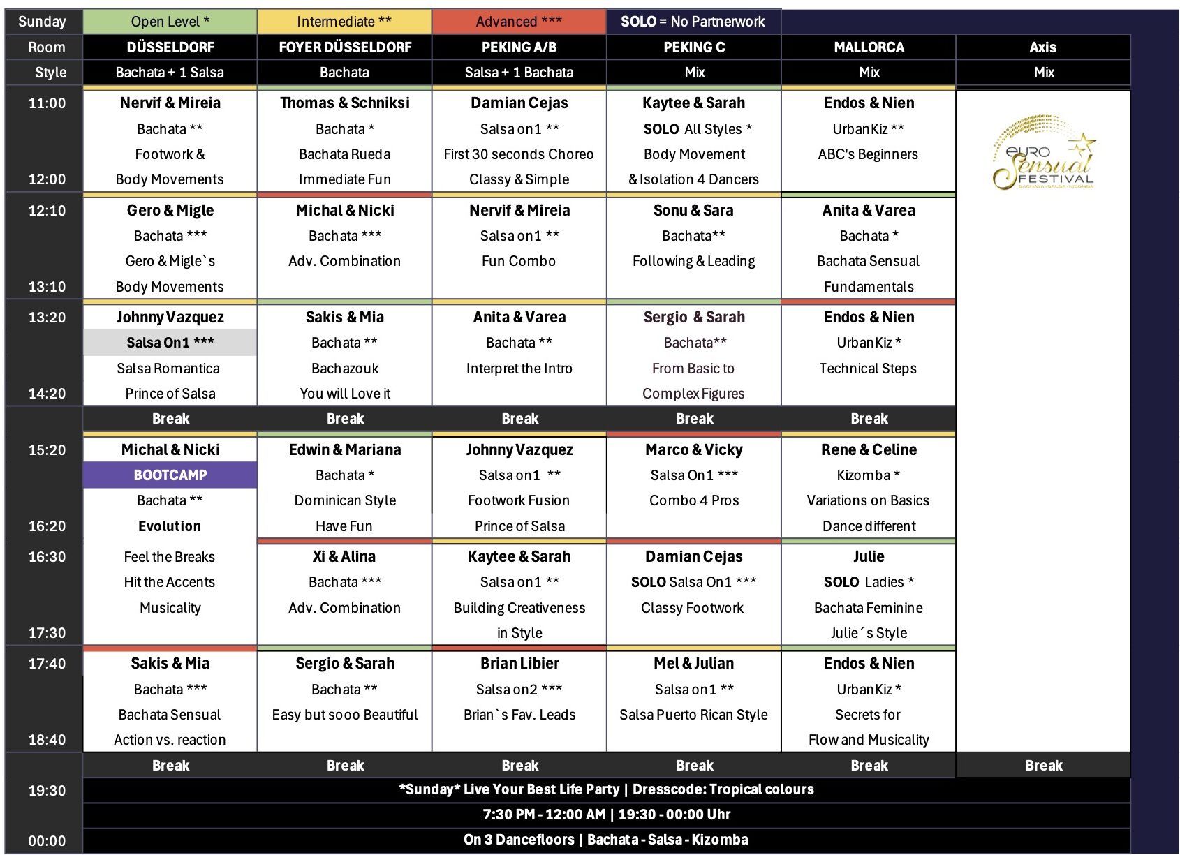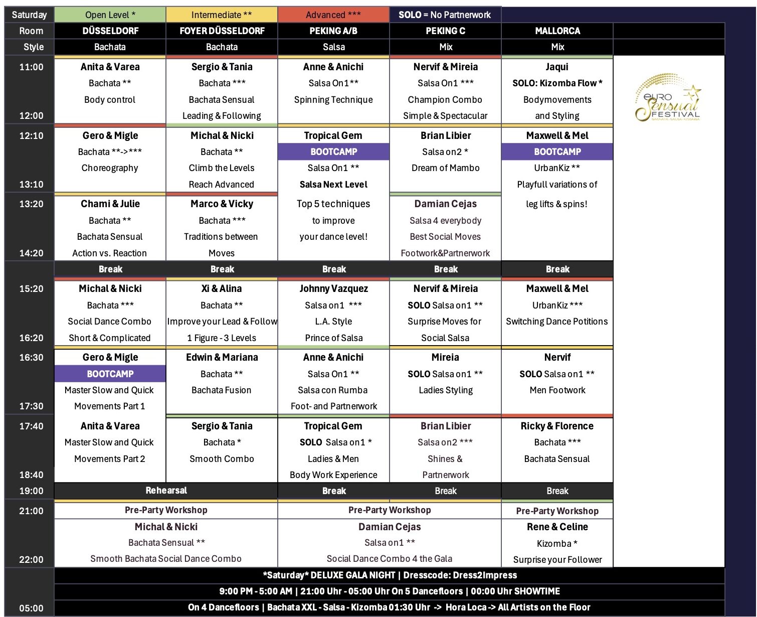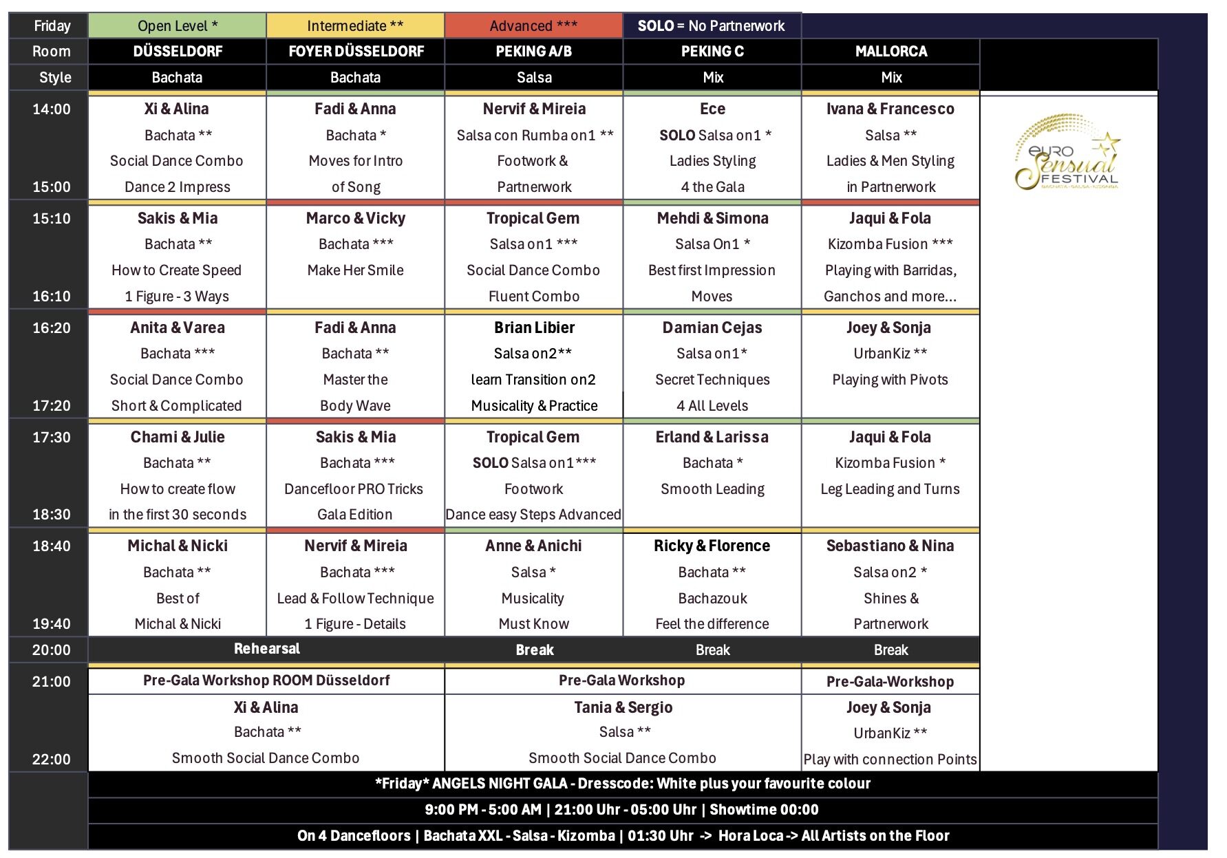 Wir wissen, dass ihr es kaum erwarten könnt, euer tanzreiches Wochenende zu planen! Der endgültige Workshop-Plan wird mindestens eine Woche vor dem Festival veröffentlicht, wahrscheinlich jedoch einen Monat zuvor. In der Zwischenzeit könnt ihr einen Blick auf den Vorjahres-Plan werfen und euch inspirieren lassen.